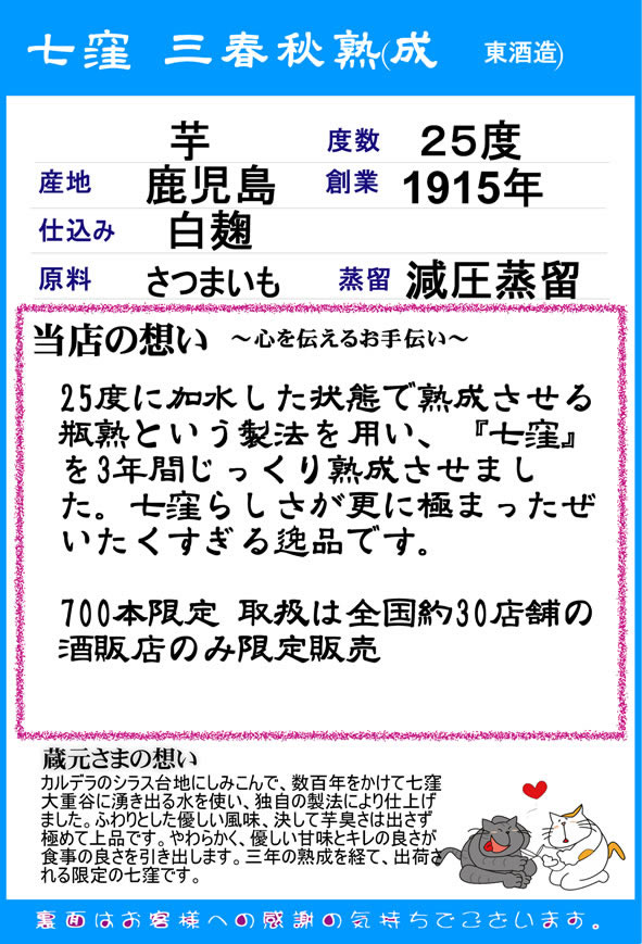 25度に加水した状態で熟成させる瓶熟という製法を用い、「七窪」を3年間じっくり熟成させました。 七窪らしさが更に極まった贅沢すぎる逸品です。