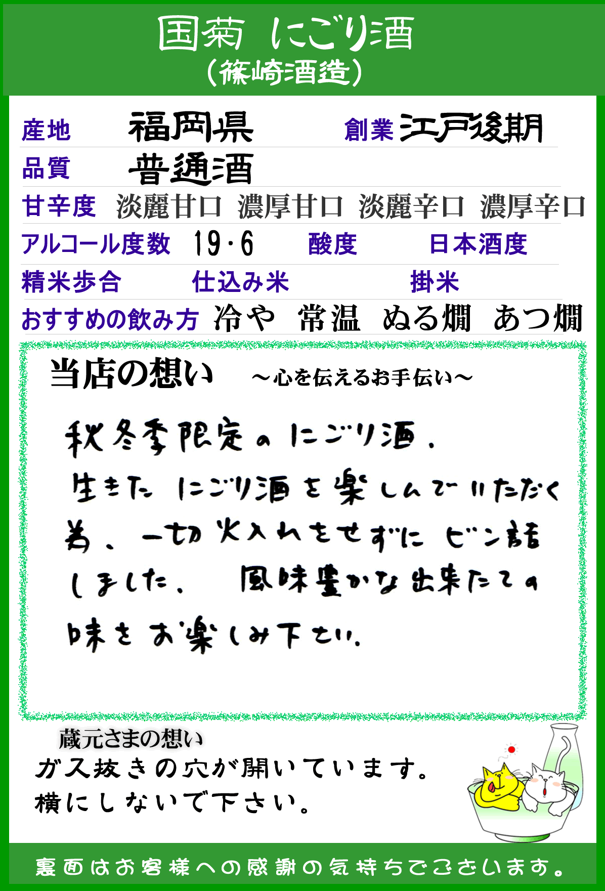 秋冬限定のにごり酒。生きたにごり酒を楽しんで頂く為、一切火入れをせずにビン詰めしました。そのため酒が生きており、出来立ての風味がお楽しみいただけます。脂・うまみの乗った冬の食材と非常によく合います。 ※活性生酒のため、王冠にガス抜きようの穴をあけております。