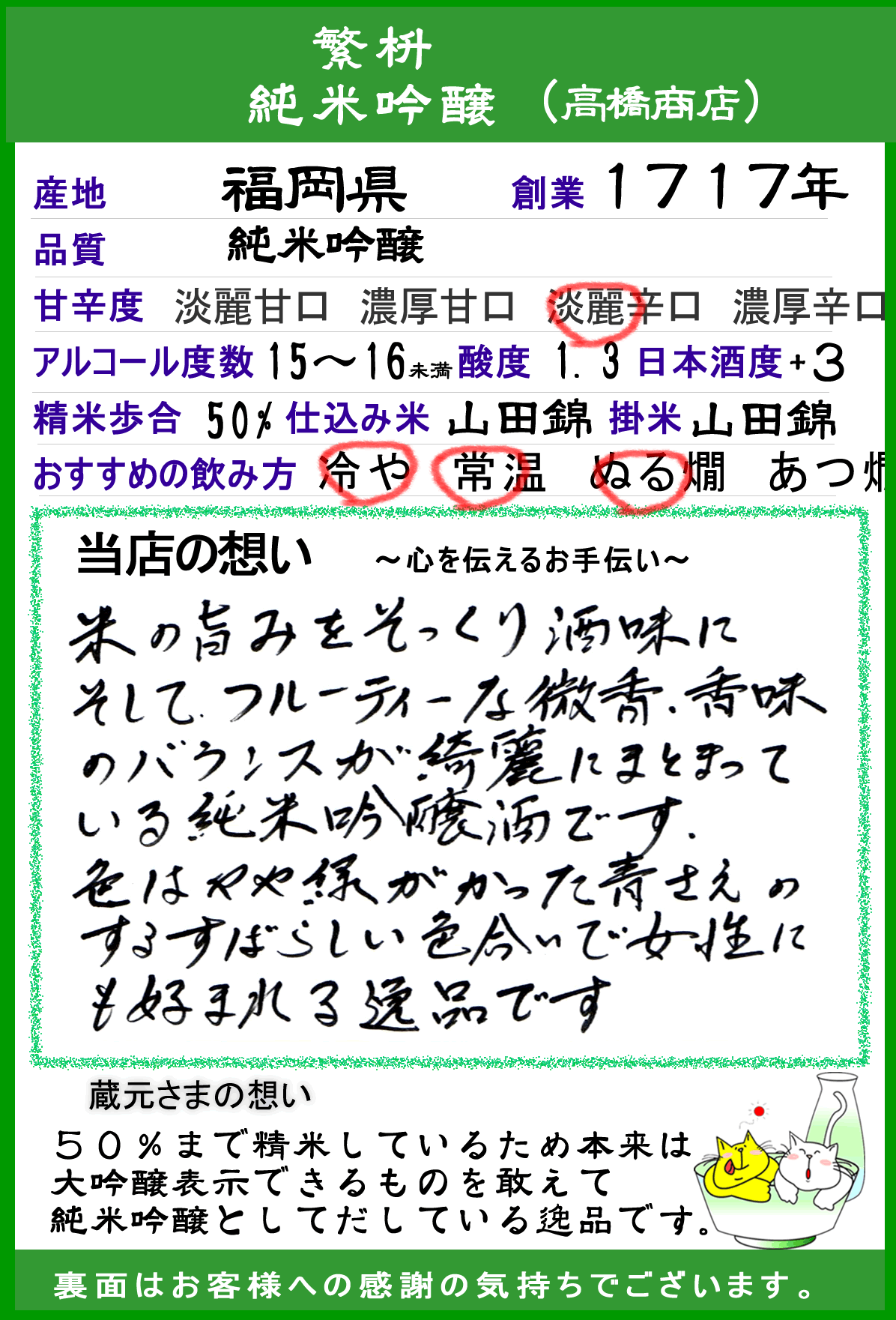 米の旨みをそっくり酒味に、そしてフルーティーな微香、香味のバランスが綺麗にまとまっている純米吟醸酒です。色はやや緑がかった青さえのするすばらしい色合いで女性にも好まれる逸品です。