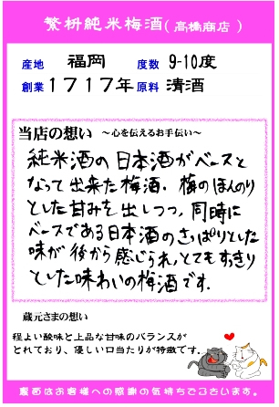 純米酒の日本酒がベースとなって出来たお酒。梅のほんのりとした甘みを出しつつ、同時にベースである日本酒のさっぱりとした味が後から感じられ、とてもすっきりとした味わいの梅酒です。