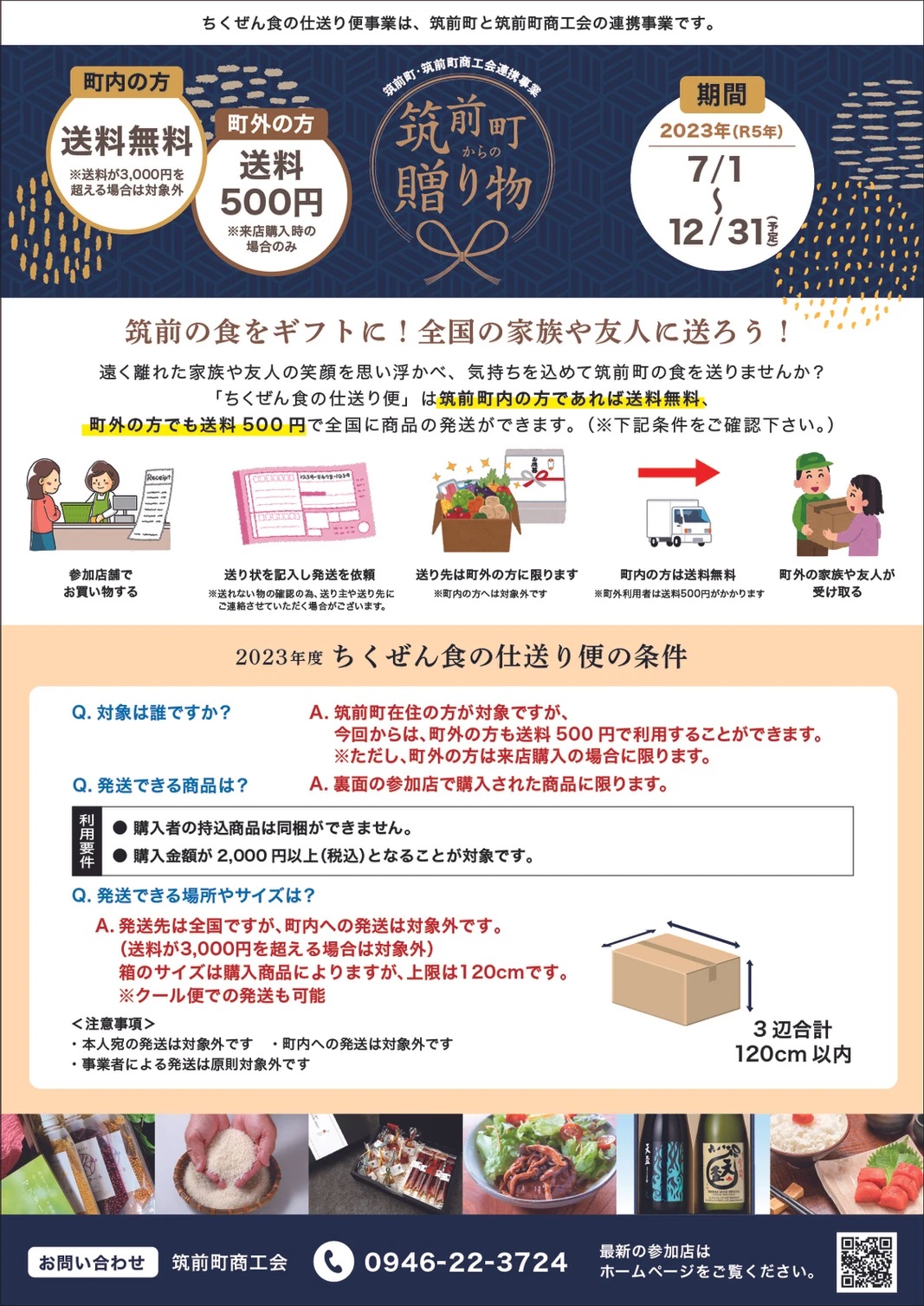 「筑前町の食をギフトに!」をテーマに、筑前町と筑前町商工会が連携して行っている事業です。筑前町内のお店から贈り物をすると送料が無料(筑前町在中の方)になるというお得な企画です。もちろん筑前町外の方も送料500円で筑前町の美味しいものを全国へ送る事ができます❣ 当店では筑前町の美味しいお酒を取り揃えておりますので、お中元のシーズンでもあるこの期間に是非ご利用下さい。皆様のご来店をお待ちしております(@^^)/~~~
