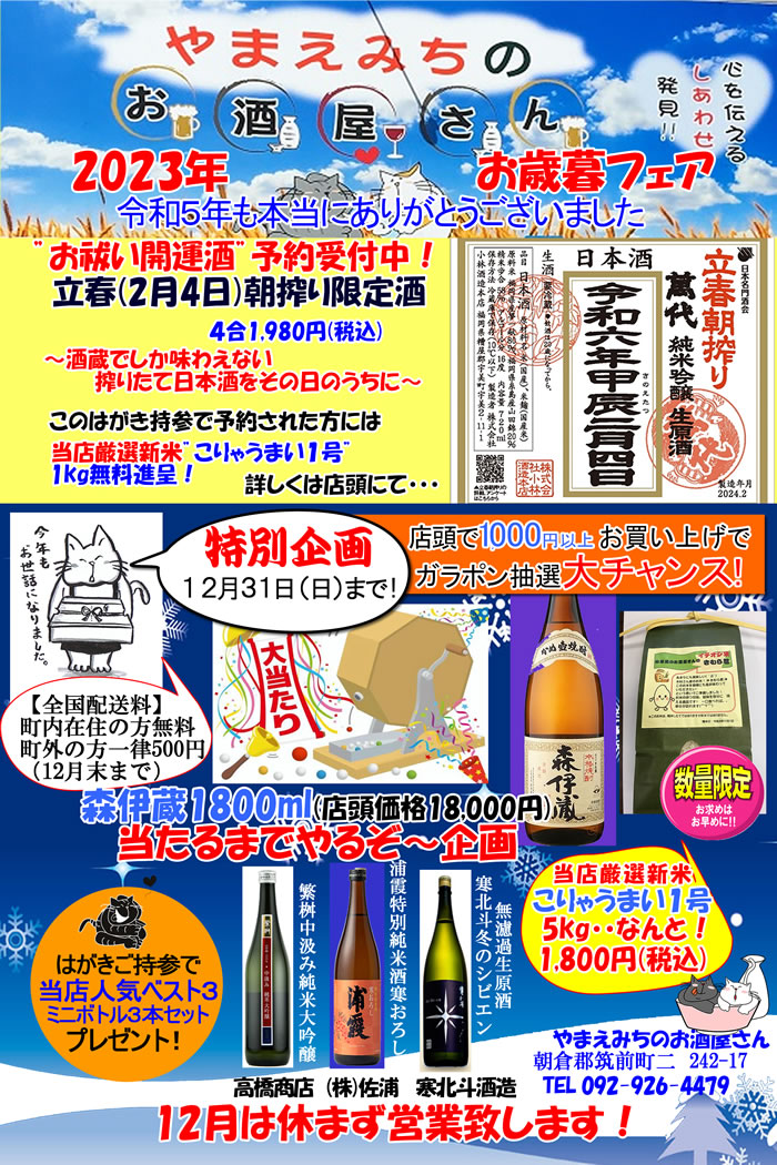 【年末大抽選会2023】開催しまーす‼‼ 2023年も残すところ1ヶ月。。。皆様!今年も「やまえみちのお酒屋さん」をご愛顧頂きまして誠にありがとうございました。この感謝の気持ちを伝えるべく★年末大抽選会2023★を開催いたします!抽選会の内容は↓↓↓↓↓です。沢山の皆様のご来店♡心よりお待ちしております‼