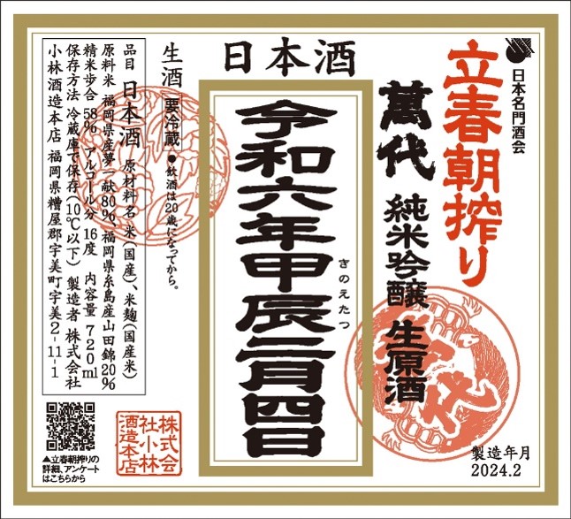 令和6年 立春朝搾り🍶予約受付中‼ 令和6年2月4日立春の朝に搾った純米吟醸生原酒🍶 無病息災・家内安全・商売繁盛などなどを祈願し『開運お祓い』を受けたその日より、ご予約頂いた皆様に店頭にてお渡し致します。 ★★★年に一度しか飲めない開運朝搾り!! この期会をお見逃しなく★★★ ご注文締切:令和6年1月24日 受渡期間:令和6年2月4日~2月29日 価格:720㎖ 1,980円(税込)
