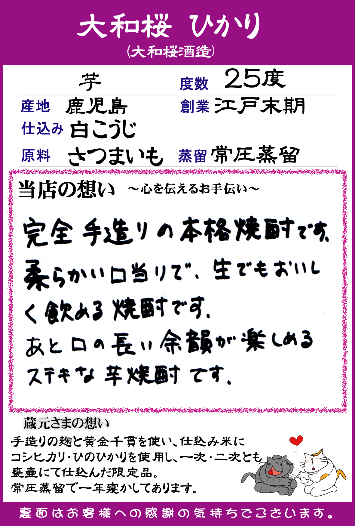 完全手造りの本格焼酎です。柔らかい口当たりで生でも美味しく飲める焼酎です。あと口の長い余韻が楽しめる素敵な芋焼酎です。